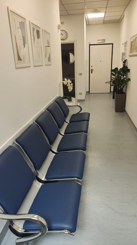 Sala d’attesa con reception e servizi igienici per i pazienti, completamente accessibili e conformi alle normative per persone con disabilità.